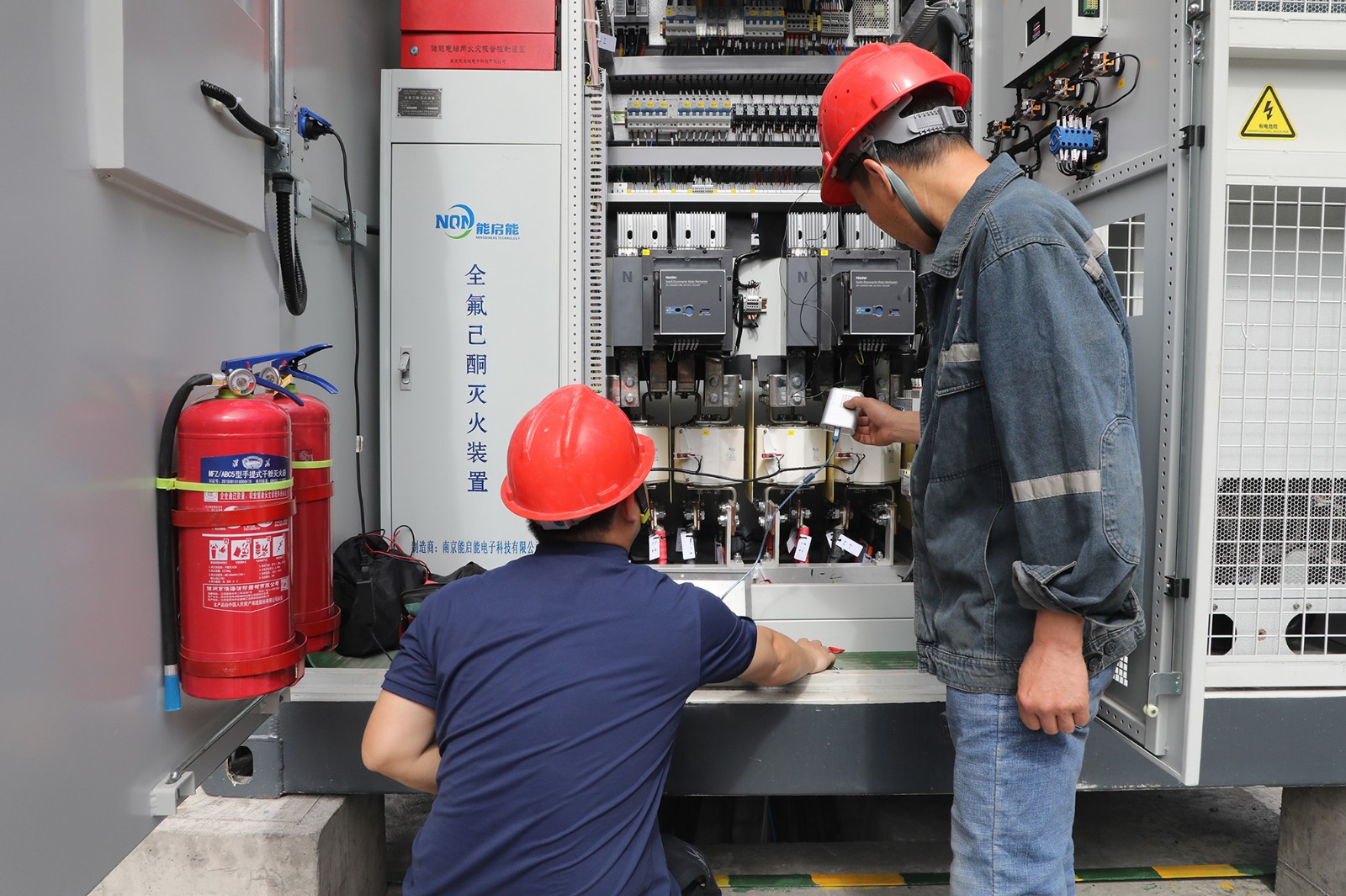 4月中旬以来,新系统储能电池舱、储能逆变器、联络开关柜等主要设备运抵后,机电队迅速完成吊装,并实现与变电站内原开关柜组的耦合。本周,随着子系统储能管理系统控制柜的抵达,综合调试全面展开。此次调试涵盖多个方面,电池舱内的液冷、消防、除湿机等辅助系统接受细致检测;升压舱进行送电测试;储能逆变器舱与电池舱之间的通讯也在紧张调试中。