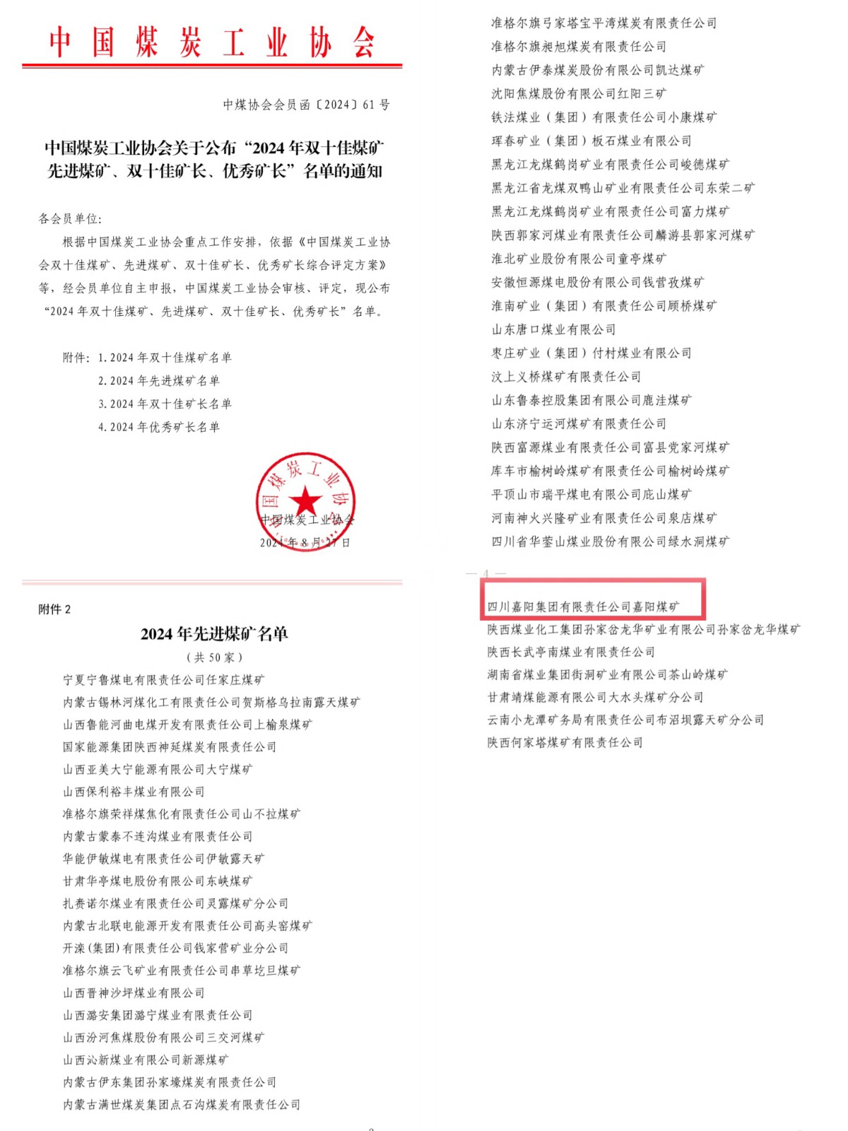 近日,中国煤炭工业协会公布了“2024年先进煤矿”评选结果,嘉阳煤矿凭借在安全生产、科技创新、经营管理等方面的突出表现,荣获2024年度“先进煤矿”荣誉称号。