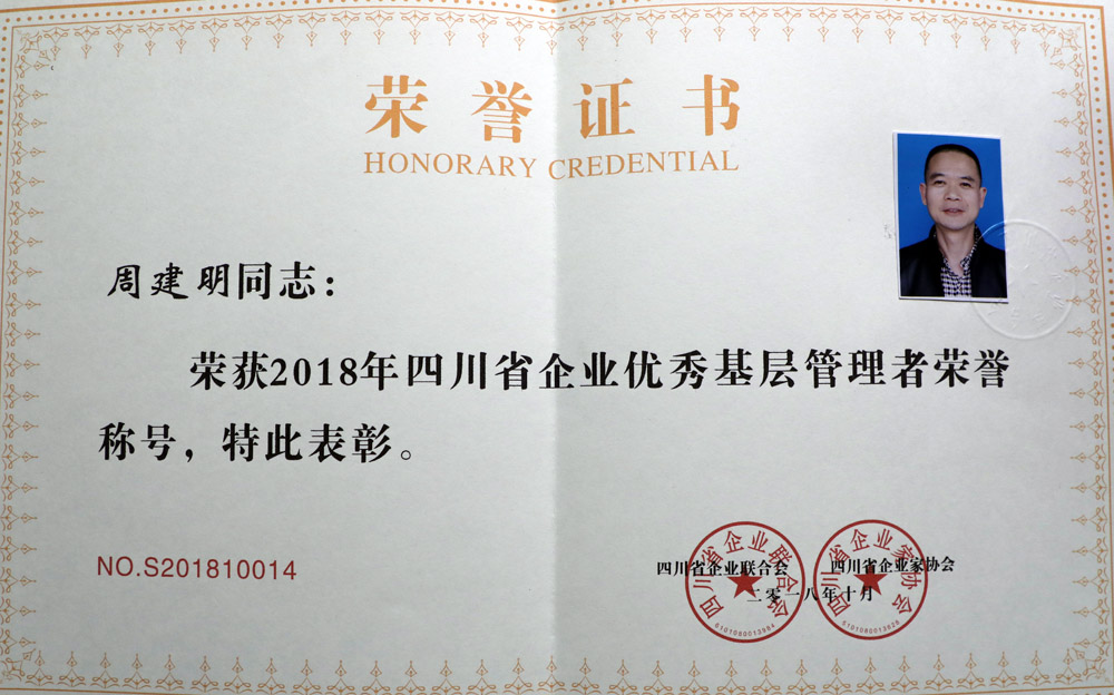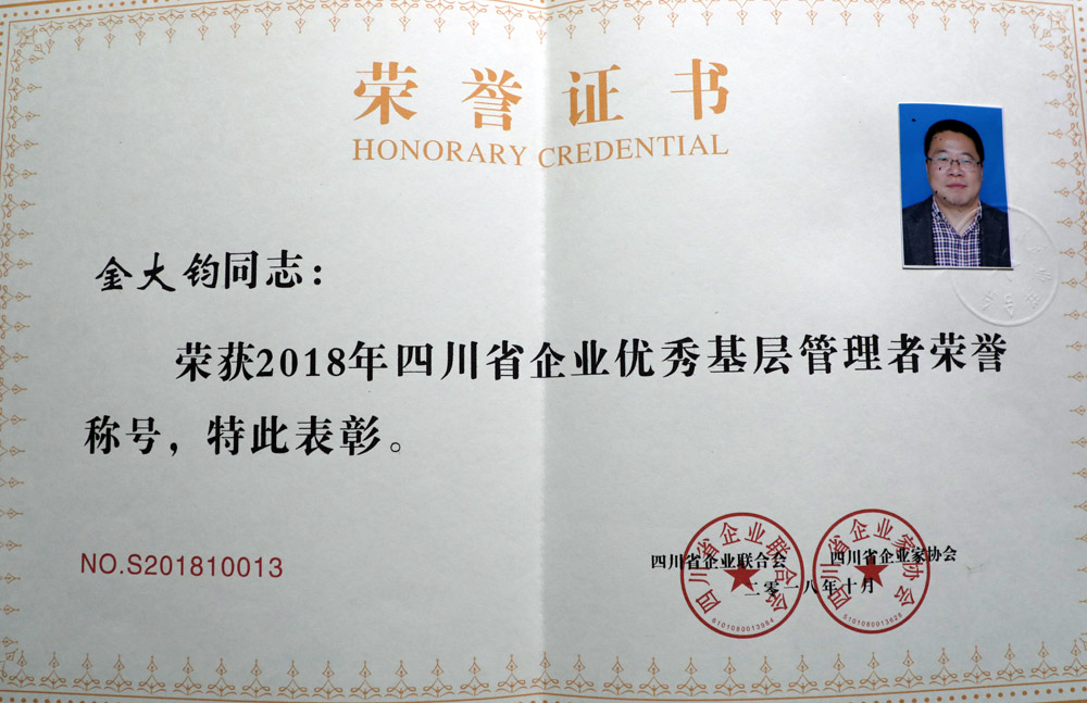 为推动企业基层管理水平不断攀升,提升企业可持续发展力,打造高端人才汇聚高地和人才价值实现高地的要求,四川省企业家联合会、省企业家协会联合开展了此次评选活动,经过推荐、会审等相关程序,最终完成了评选。公司副总会计师兼经营财务部部长金大钧,公司纪委副书记、审计部部长周建明恪尽职守,勇于奉献,为企业转型升级发展作出了贡献,在此次评选活动中被授予“优秀基层管理者”称号。