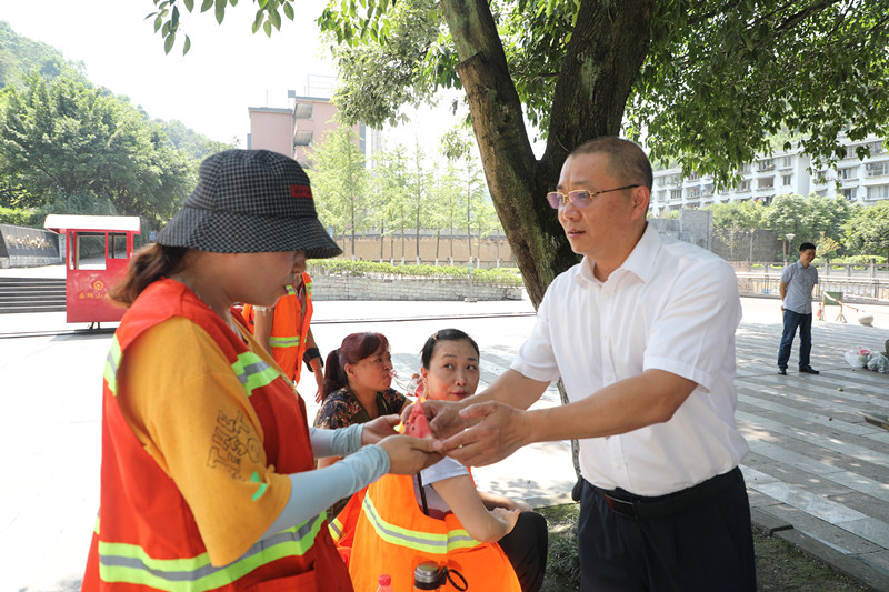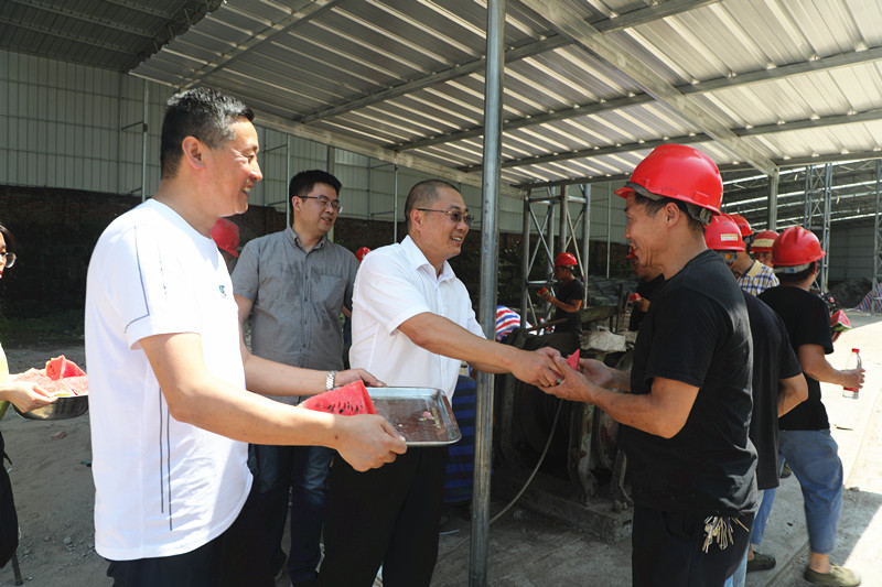 “师傅们,歇一歇吃块西瓜凉快、凉快!”在主碑广场,范总经理亲切地招呼正在这里修剪树枝的作业人员、环卫工人们,并将清凉的西瓜和矿泉水递到他们手中。在预制厂改造工地,范总询问了解工程情况,叮嘱作业人员:“天气炎热一定要做好防暑降温措施,注意自身健康。”大家开心地发出爽朗的笑声,对公司领导、党员同志们顶着烈日来看望我们、给我们送来清凉表示非常感谢,大家的关心与鼓励给了我们战高温、斗酷暑的勇气和力量,我们必将不畏高温、坚守岗位,保质保量地完成生产任务。