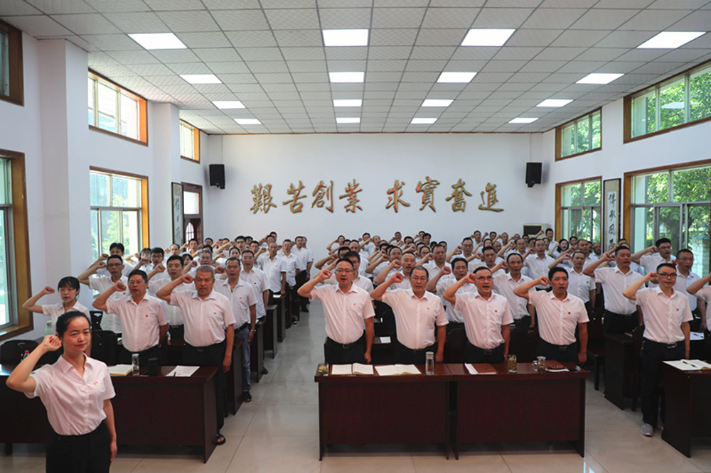 面对鲜红的党旗,100名共产党员举起右手,发出铮铮誓言,响亮的声音在办公楼久久回荡。